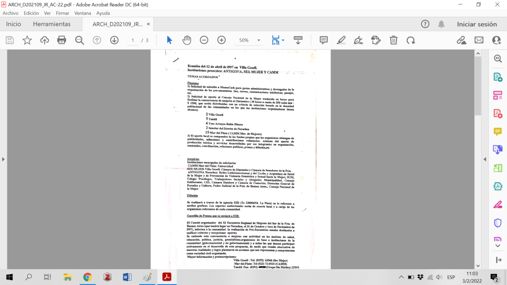 Acta reunión entre Centro de Apoyo a la Mujer Maltratada, Antígona y Ser Mujer