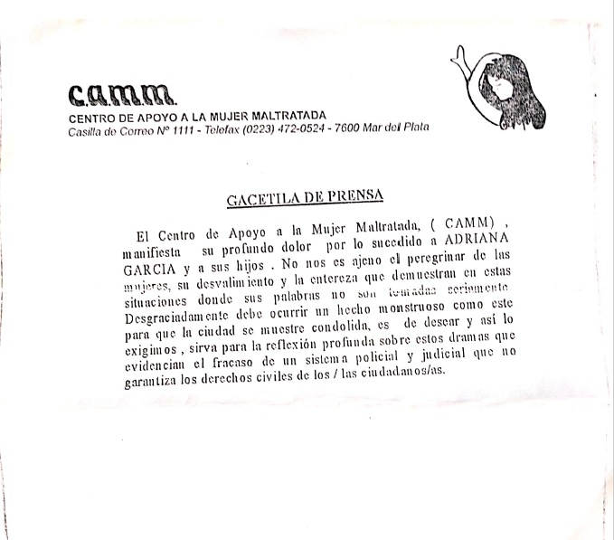 Gacetilla de prensa por el femicidio de los hijos de Adriana García