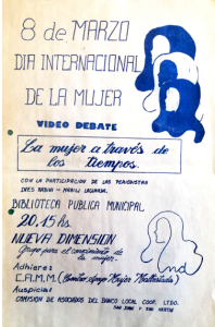 Folleto Día Internacional de la Mujer e invitación para asistir al video debate: «La mujer a través de los tiempos». Evento organizado por Nueva Dimensión y con adhesión del CAMM, a realizarse en Biblioteca Publica Municipal de Mar del Plata.