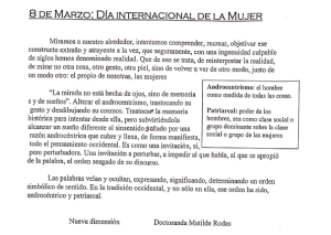 Gacetilla de prensa de Nueva Dimensión por el 8 de marzo, día internacional la mujer. Breve historia de la efeméride, reflexión de Matilde Rodas e invitación a contactarse con la organización.
