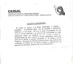 Gacetilla de prensa por el femicidio de los hijos de Adriana García, a mano de su padre y ex pareja de Adriana. Octubre del año 2000.