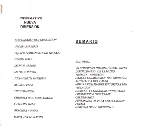 Informativo de Nueva Dimensión. Sumario del informativo: Editorial. VII Congreso interdisciplinario de la mujer. Hablan las mujeres del grupo de autoayuda del CAMM. Mitos y realidades en torno a una violación. Ejercer y construir ciudadanía. Prejuicios a desterrar. Celebramos. Pensamientos para coleccionar. Poema. Historia de la impunidad.
