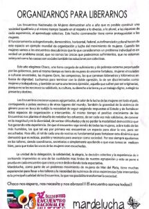 Folleto titulado «Organizarnos para liberarnos», que invita a viajar al Encuentro Nacional de Mujeres a realizarse en Chaco en 2017.