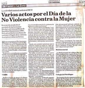 Nota periodística publicada el 25 de noviembre de 2008, en la que se enumeran y comentan las actividades a realizarse en la ciudad de Mar del Plata a propósito del Día de la No Violencia contra la Mujer.